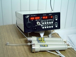 Пневмомассаж конечностей Прерывистая или перемежающая компрессия используется при хронической венозной недостаточности и лимфостазе, как средство борьбы с отечным синдромом. Выполняется погружением конечности (рука или нога) в специальный многокамерный мешок. После закрепления мешка в его камеры поочередно под высоким давлением нагнетается воздух, таким образом, чтобы волна этого воздуха распространялась по конечности снизу вверх в направлении к сердцу. Диагностический центр в физиотерапевтическое отделение приобрел аппарат прерывистой пневмокомпрессии «Пневмомассажер ПМ». Механизм действия переменной компрессии состоит в том, что устраняется венозный застой, снижается фильтрация тканевой жидкости, улучшается насыщение тканей кислородом, стимулируется отток лимфы и венозной крови, повышается фибринолитическая активность крови. Разные заболевания требуют различного давления в камерах аппарата, которое подбирается индивидуально. |